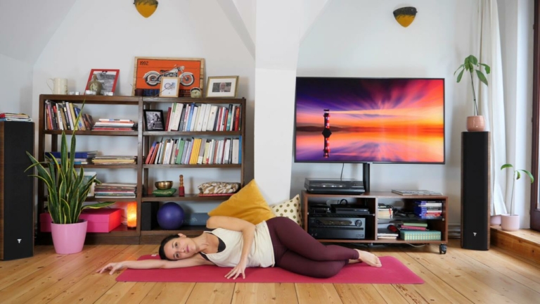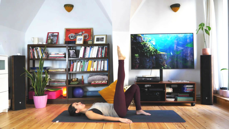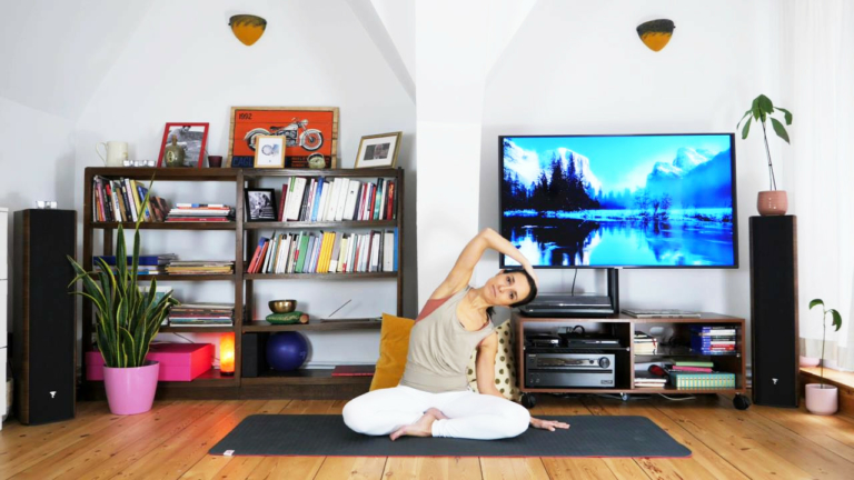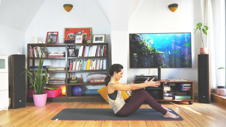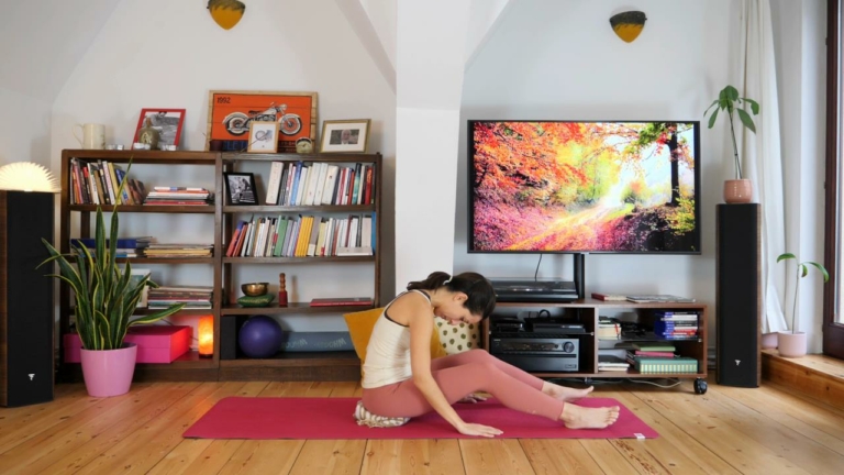 9 min.Con gentilezza, ci prepariamo a The Spine Stretch, con alcune varianti adatte a chi non si senta particolarmente flessibile.